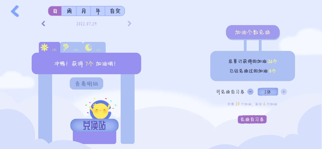 前文提到的别人给予你的加油和好梦就可以在此兑换成所对应的自习券和睡眠券。当然你也可以给予他人这样还会获得余香,也可以兑换东西