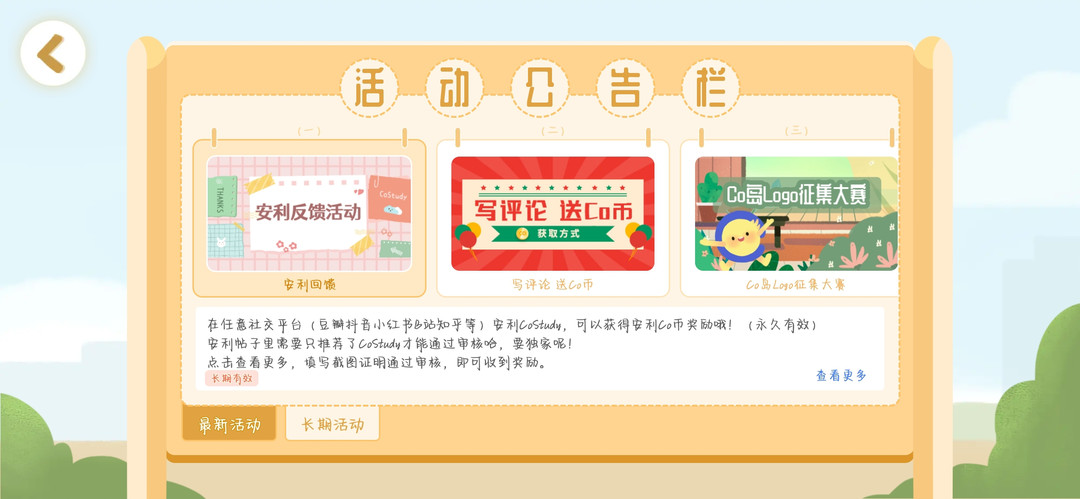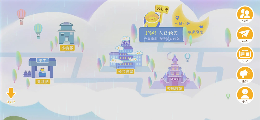 costudy是一款“宝藏学习软件”画风清新,页面简洁,却又不失趣味。共分为三个大区: 睡眠区,自习区,活动区