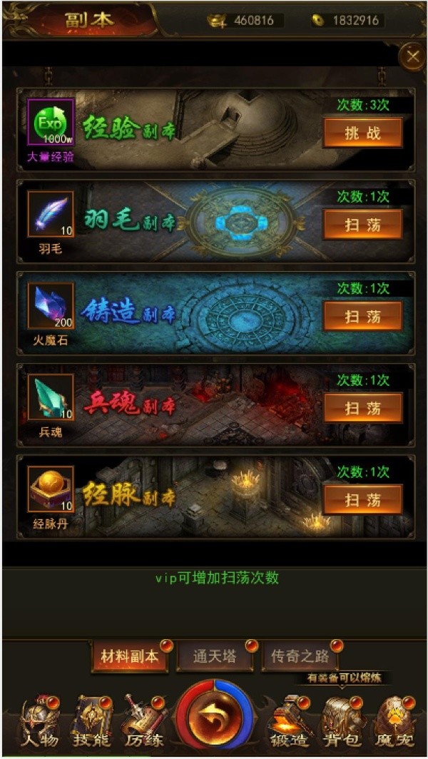 ③副本有多个类型,次数分开消耗,通关后可以扫荡,vip可以获得额外的次数;