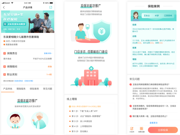 分区清晰展示保障责任、保险期间、职业类别、年龄限制等规则,一目了然;插画形式浓缩提炼产品特色,增加趣味,高效宣讲,通俗易懂,理赔流程提前告知,放心安心,保险案例举例说明,清晰明确,常见问题直接展示,快速便捷。