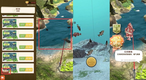 如2图中红框所示的位置,点击即可进行钓鱼,但不是一次就能钓到的哦,需要耐心的多钓几次。红纹鳜鱼生长在水里,所以比较好找,但没有那么好钓到哦~