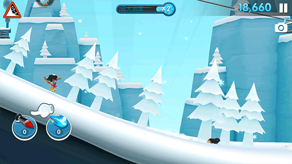 3、屏幕左侧上方的雪崩警示牌会在雪堆即将接近时不断地闪烁以示警告,即时你已经在视野中能够看到背后奔腾而来的大雪,如果此时爬起继续滑行,那么甩掉这近在咫尺的雪堆也并非不可能。