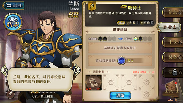 当英雄精通前置职业以后就可以转职,兰斯的当前职业是鹰骑士,可以最终转到皇家骑士或者龙骑统帅、骑士。精通某一职业永久获得相关属性的加成。