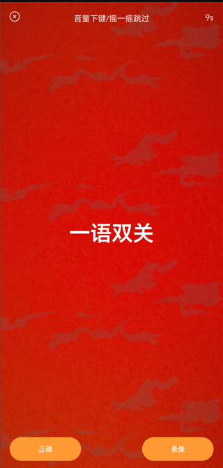 3、进入后,玩家就可以对出现的成语进行表演,让拿手机的朋友猜成语,猜对后点击正确进入下一题。若觉得成语很难时可以按下音量下键或者摇一摇手机跳过该成语