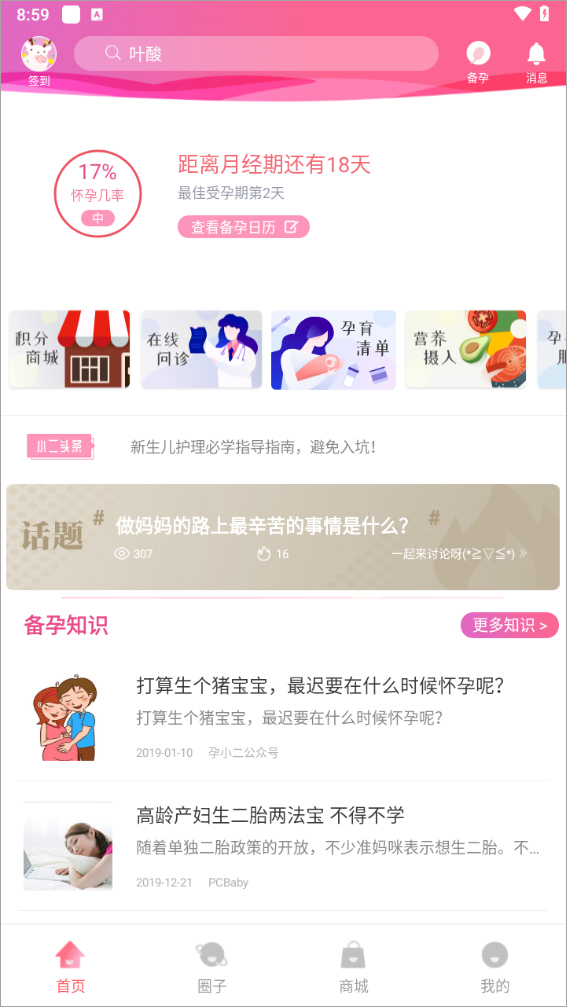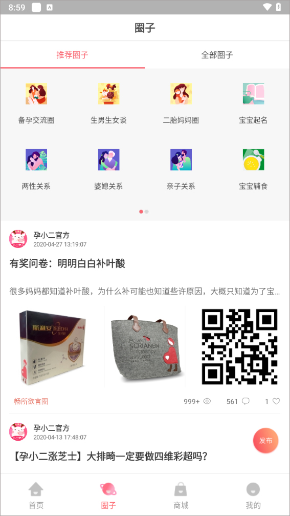3、在圈子这个界面可以进入备孕交流圈,还会有官方小二的有奖问卷调查