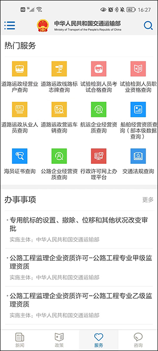 3、该软件除了能够查看各种政策新闻之外,还提供了非常专业的查询功能,例如:查询交通运输法规法则、职业资格成绩证书查询、技师和高级技师查询等各种职业资格信息查询帮助。