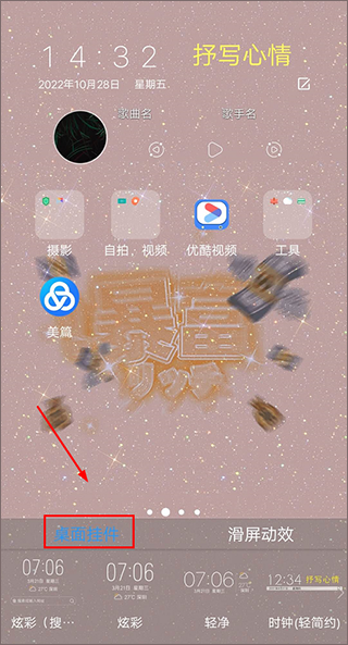 1、长按手机桌面,直至下方出行桌面挂件选项;