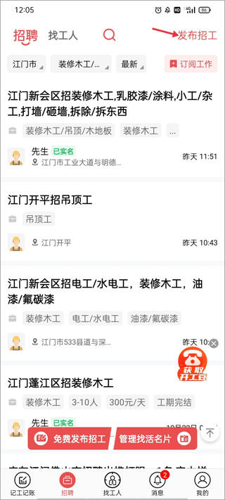 1、先切换到【招聘】页面,你可以看到这里有很多的招聘和求职信息,点击右上角的“发布招工”。