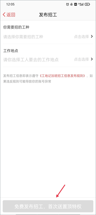 2、选择你需要招的工种以及工作地点,最后点击下方按钮“免费发布招工……”,就能把招聘信息发布出去了。