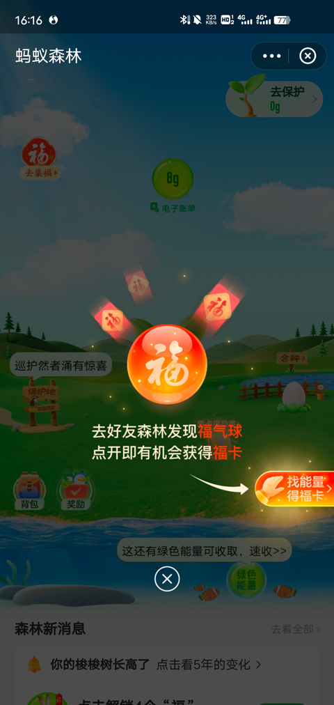 2、通过支付宝蚂蚁森林每天可以获得支付宝福卡,也就是有机会获得支付宝万能福卡以及顺手牵羊卡。