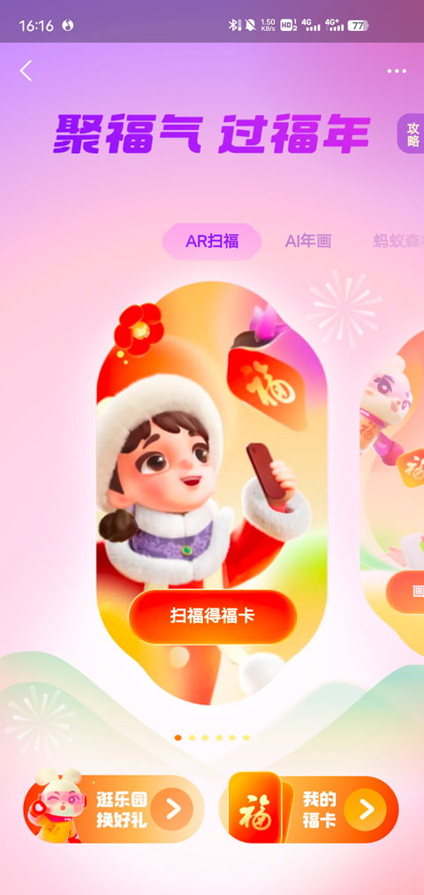 1、扫福字能有机会获得福卡,一般来说一天只能扫福获得三张福卡,所以活动开始后一定充分利用每一天的次数。