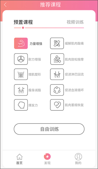 2、在发现这一板块中,可以看推荐课程和视频训练,比如力量增强等环节