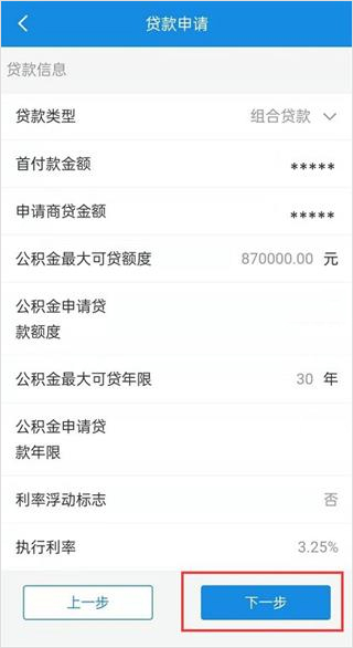 3、填写贷款信息后,点击“下一步”。