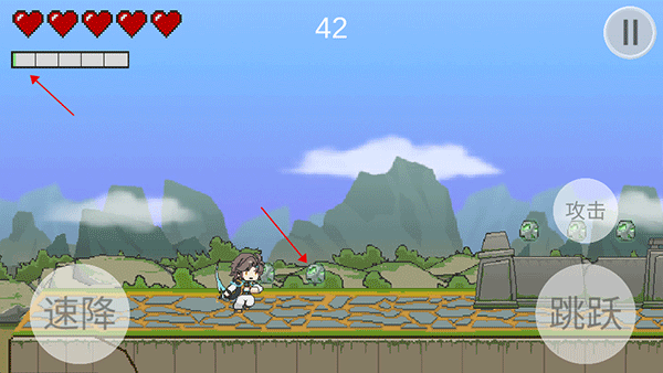 2、直接开始游戏,玩法类似于跑酷,左边的速降可以让你的速度慢下来,如果前方遇到陷阱的话可以点击跳跃,如果遇到小怪点击攻击即可