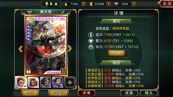 每张卡牌都有其独到之处,合理的分配武将以及均衡的搭配,主公大人称霸天下指日可待