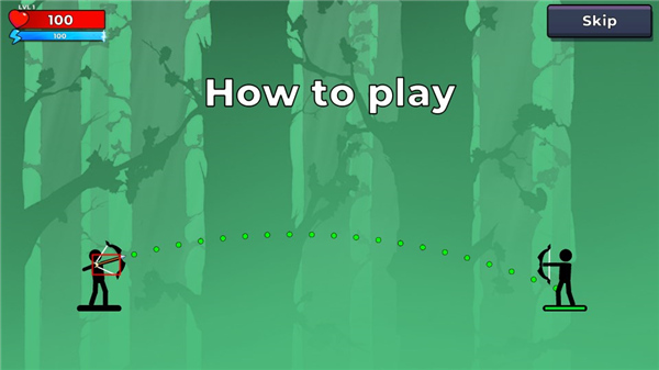 这款游戏的玩法非常简单,玩家需要通过指尖控制弓箭的调整角度和力度,不断击败处于不同位置的火柴人对手。需要注意的是,游戏中玩家需要击中2箭,方可消灭敌人,而击中头部只需要一箭就能死亡,所以玩家利用物理特性,控制好弓箭方向,争取一击即中。