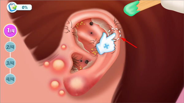 1、玩家进入游戏,首先是新手关卡,主要是引导玩家如何帮病人清理耳朵上的脏东西和发炎的地方;