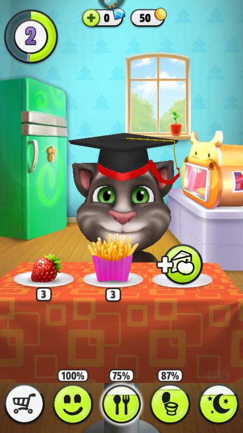 游戏特色包括从1000多种颜色、衣服和家具中选择搭配,帮助汤姆完成9个阶段的999级成长,通过互动对话让它重复玩家的话,还有戳、摸或挠它痒痒的不同反应。此外,新增了汽车蛋糕、兔子椰奶冻等食物,还增加了合成食物的功能,让玩家自己动手制作。