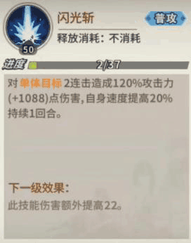 [闪光斩]普攻即会提高自身20%速度,配置了当前版本唯一能增加自身速度的普攻效果,最大化自身速度,配合自身绝技和被动,增强输出和生存能力。