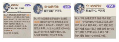 [动若闪光]闪光弗莱士的核心输出技能,不仅自身会对敌方速度慢于自己的单体造成攻击力80%/80%/100%的伤害,还会对敌方全体造成每次攻击力60%/70%/80%的伤害,换言之,每回合三次追击后就造成了一个不费火的全体180%/210%/240%的全体伤害。注意,这个全体伤害是我方追击就可触发,所以己方存在原子武士、兽王、饿狼、地底王等英雄时也可以触发其被动。