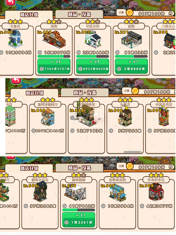 显示了推荐的几个最赚钱的店,当然珍珠岛上面的店铺基本都不亏,能清空就清。另外可以攒金条买设施绿化爱好协会,这个建立到每个地图上,整体收益基本翻倍(前提是你要有绿植)