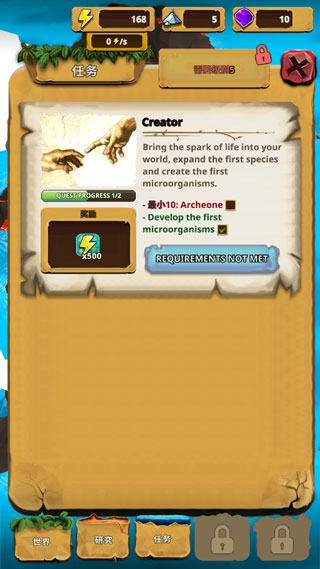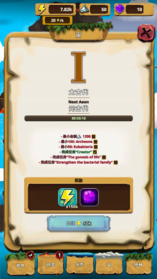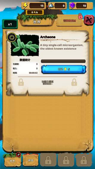 游戏特色包括独特的威望系统、丰富的剧情、多样的任务和数百种可发现的物种。通过“研究”标签页开始第一次研究后,你就能在“世界”页面创建生命并进行养成。完成初始细胞创造后,能量会自动增长,但要加快进度还需完成任务或发现稀有物种。