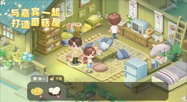 玩家会在蘑菇屋和嘉宾一起吃饭、聊天,打造属于我们自己的房子。