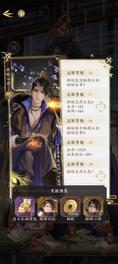 灵犀值升级也是有奖励的,灵犀值最高可以提升到20级,每达到一定等级,我们将获得角色碎片、礼物和金币作为奖励。同时,达到最高级别的灵犀值还将获得角色的心语,要知道专属心语是非常难抽,极其看运气。