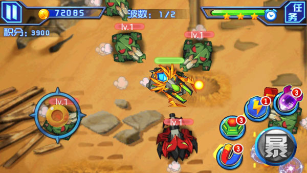 游戏操作方面跟普通的射击类游戏没有太多的区别,刚开始也会有非常详细的新手教程,只需通过滑动屏幕中的虚拟摇杆,便可控制铠甲勇士上下左右的移动位置,而发动基础射击都是全自动的,在用左手滑动控制虚拟摇杆的同时,右手同时还能操控点击释放不同的道具技能。二则相互配合,缺一不可。