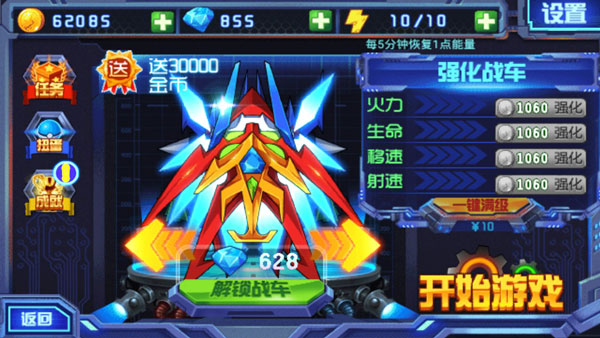 (1)强化战车总共有四种途径,火力即为增加攻击力,生命增加战车的血量,移速和射速自然就是增加战车的灵活性,每种属性升级所需金钱是一样的,随着强化等级增加消耗金钱增加。