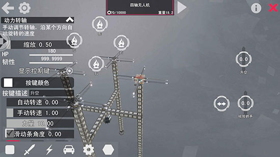 安装完成后,最重要的一步就来了,我们要通过点机械名称旁的按钮来使机械进入模拟场中,测试它的运动状态。将旁边的飞行按钮上拉,即可测试飞行状态。然后根据出现的问题,调整不同零件的参数。有的人飞行器会飞不起来,有的人飞行器会偏离直飞的轨道,还有像小编一样一着陆就散架了的……遇到这些情况不要担心,合理排查出现问题的位置,调整当前螺旋桨扇叶参数,或者检查机械连接是否牢固,即可轻松解决。