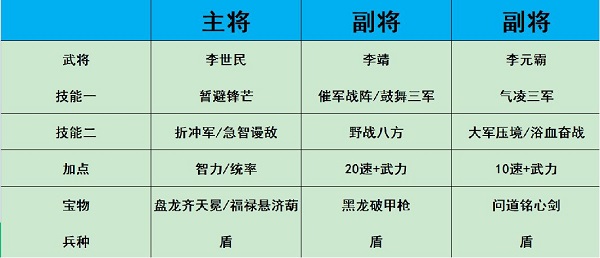 折冲军因为至少3周才能出来,这时候的李世民可以带急智谩敌,加点为统率做副将,李靖做主将进行主力输出。大军压境获取难度也高,平民一般一个月才能获得,所以前期可使用浴血奋战替代。兵种在没有上折冲军之前,可以随便切换盾枪,上了折冲之后就固定盾兵。另外在李世民没有6星或者没有折冲之前,其实是可以使用高颖或长孙皇后对李世民进行替代的,PVP能力可能更强。
