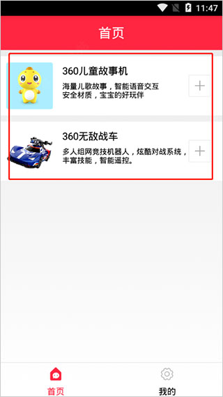 1、下载安装好360儿童app后注册登录进入首页,我们可以看到有两个产品,点击故事机后面的+;