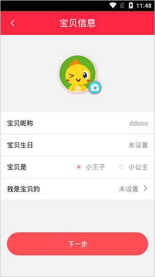 2、接着填写宝贝昵称、生日、性别、头像、关系等信息;