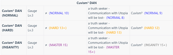 12级以下谱面的定数,均为谱面原标级难度(即所有12级谱的谱面定数均为12,以此类推);13级及以上的谱面则含有细分至0.1的谱面定数。