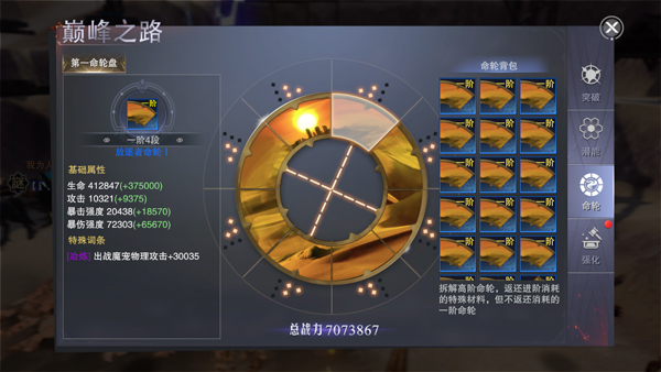 突破巅峰等级后,还可解锁8件“命轮装备”,每件装备都附带强大的基础属性。对命轮装备进行进阶、强化以及洗练等操作,还可以获得额外的属性提升。提升所需的材料、装备也都能通过暴风裂隙、狮心荣耀、野外首领以及个人首领等日常活动获取。还有就是,多余的装备可以用来升阶,不要卖掉或者分解。