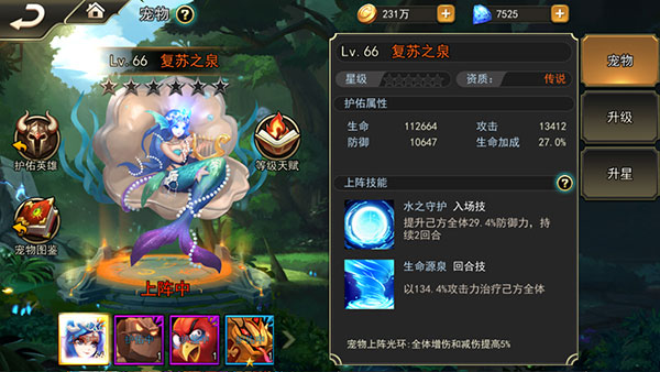 1、 复苏之泉,金色宠物,入场提升己方全体防御力,持续两回合;回合技是治疗己方全体。这个宠物非常适合无奶的阵容,为团队提供续航能力。