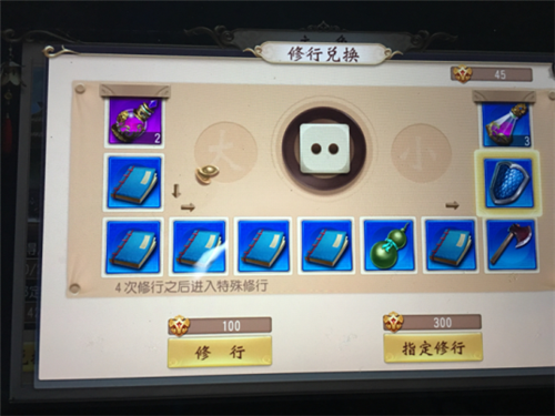 这时你就闭着眼睛点修行吧,每次100点,不建议使用指定修行,浪费点数,而且前期的修行奖励都很实用,没有垃圾一说,所以摇到什么算什么,特殊修行就是全部是二级辅助书,随便摇。