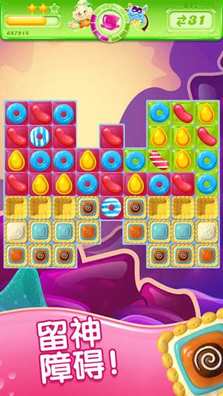 值得注意的是,在本作中玩家所要做的并不是消除糖果获得分数,而是在消除糖果的同时,果冻会覆盖到被消除的糖果格子上,玩家需要让这些果冻覆盖到所有的格子中才算是过关,而这一切都是有步数的限制的。