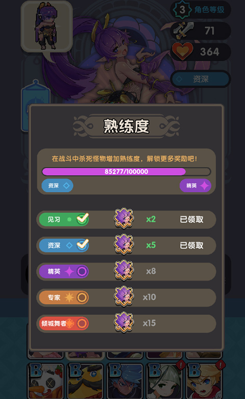 2、在装备中,通过选择角色在战斗中击杀怪物可以增加熟练度,当熟练度到达一定数量后,可以开启等级提升。由见习转变成资深,当角色等级提升后,不仅可以获得封印石还可以解锁角色碎片。