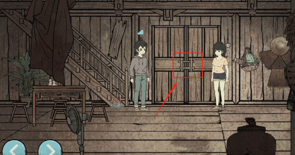 5、从室内的木梯走向2楼,来到第3个房间的门口,在竹篮子里得到【符号环】