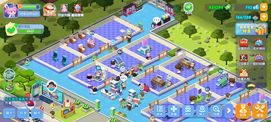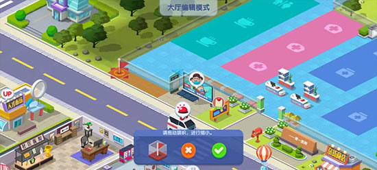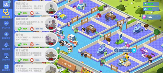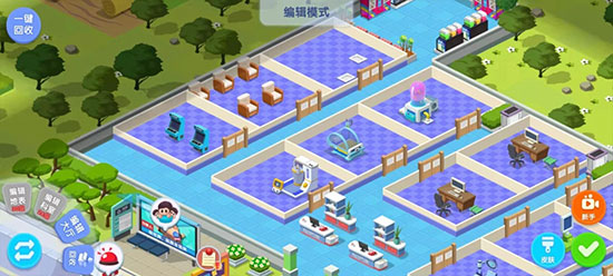1、玩家可以在超大游戏地图场景里,根据自己的游戏资源,扩建医院、设立科室,购买各种装潢。