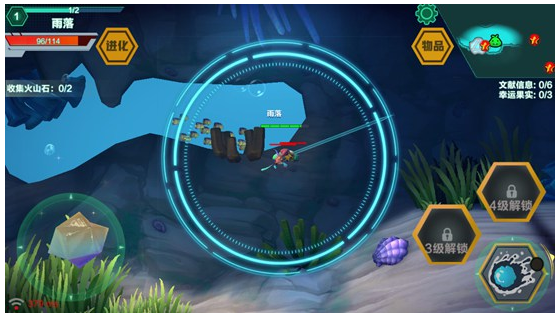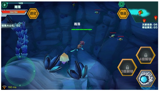 进入游戏后我们在海底,可以滑动左下角的摇杆移动怪物,从左右两边进行探索,在探索的时候如果看到一些小鱼小虾,就可以点击右下角的技能攻击它们。