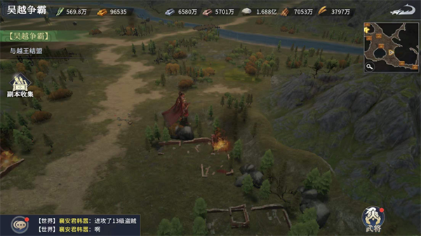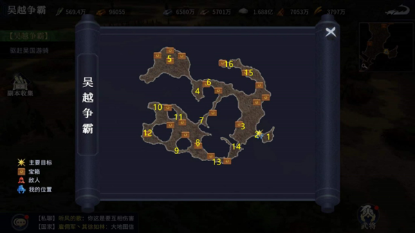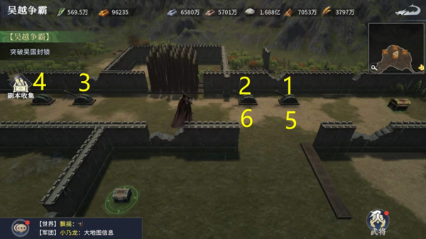 然后来到13的位置清理掉吴国士兵,沿路往上来到14击杀木伯羊,15击杀吴国中军,16击杀吴王夫差。大功告成,一路走别忘了一路点宝箱,21个宝箱,黄金刀币资源箱还是不少的。小编初步统计,简单、中等、困难难度,分别可以得到黄金780、990、1085G,总共2855G。最后不要忘了点副本收集中的任务奖励,一共6个黄金点将令和建筑加速。没点之前,2个支线任务还可以去补做的,点了之后就做不了了。