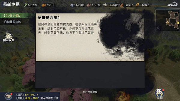 小编就吃了两次亏才知道。接下来是去地图10那里,然后做范蠡献西施支线任务,去11那里和范蠡对话2次,去12桃花林那里找桃花,