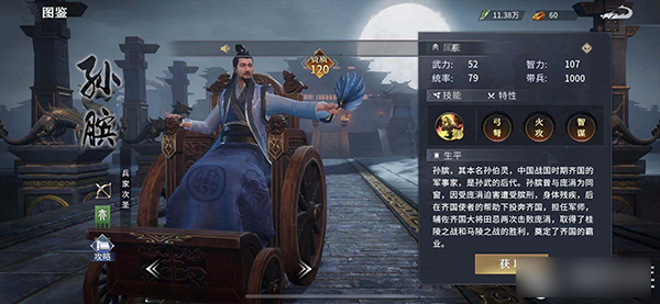 3、孙膑,橙色级别武将,武力52,统率79,智力107,带兵1000,技能召唤烈焰群体攻击敌方,特性能力是远程弓箭手性质。