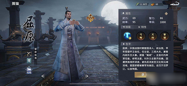 5、屈原,橙色级别武将,武力69,统率95,智力86,带兵1000,技能可以让敌方缴械8秒,特性远程弓箭手。