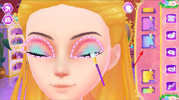 2、首先给公主化妆,从眉毛、眼妆开始,玩家点击右侧工具栏,根据自己的喜好给公主化妆;