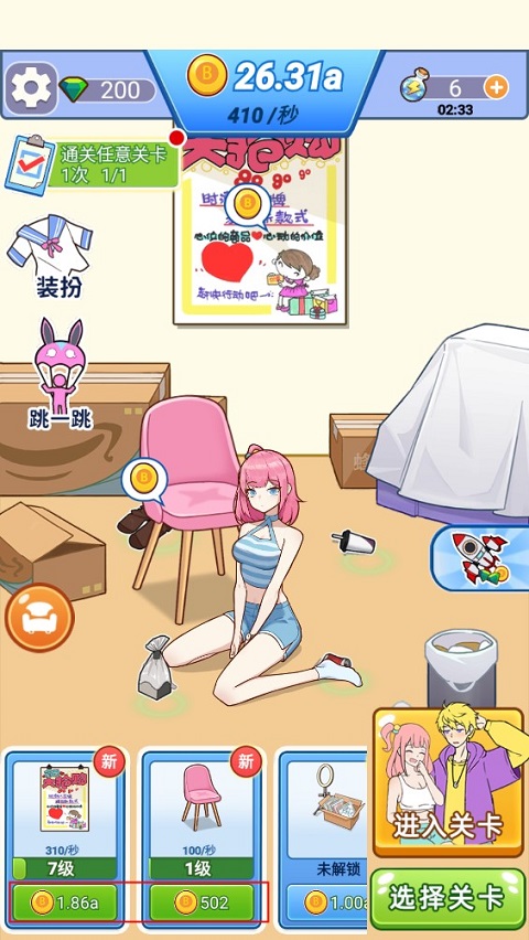 目前玩法主要分为益智解谜的闯关挑战,还有放置点击的装饰环节。在关卡挑战中,点击场景的道具,并加以使用即可通过,部分道具有使用陷进,需要玩家仔细观察;在装饰环节中,点击升级卡片可以获得丰厚的离线收益,期间你还能体验跳一跳小游戏,亦或者通过装扮,解锁女主播服装。