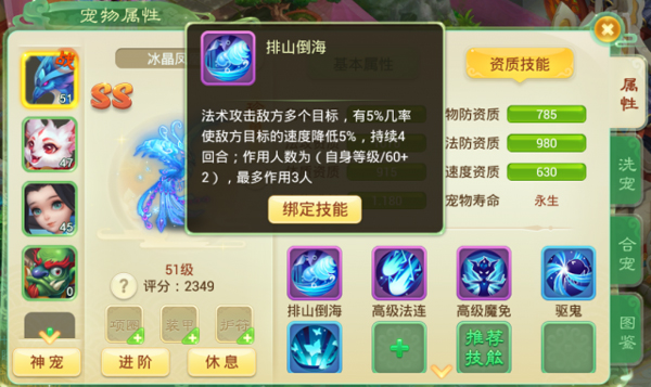 3.特殊技能:宠物特殊技能不同于初级和高级技能,如单体物理攻击法术“善恶有报”等。